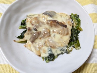 - 耐熱皿にほうれん草を入れて3をのせ上にチーズをかけてオーブントースターで焦げ目がつくまで焼いて出来上がり。