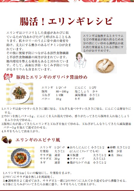 エリンギはコリコリとした食感があわびに似ているため“白あわびたけ”と呼ばれることもあります。低カロリーのうえに以下の効能があると言われています。
